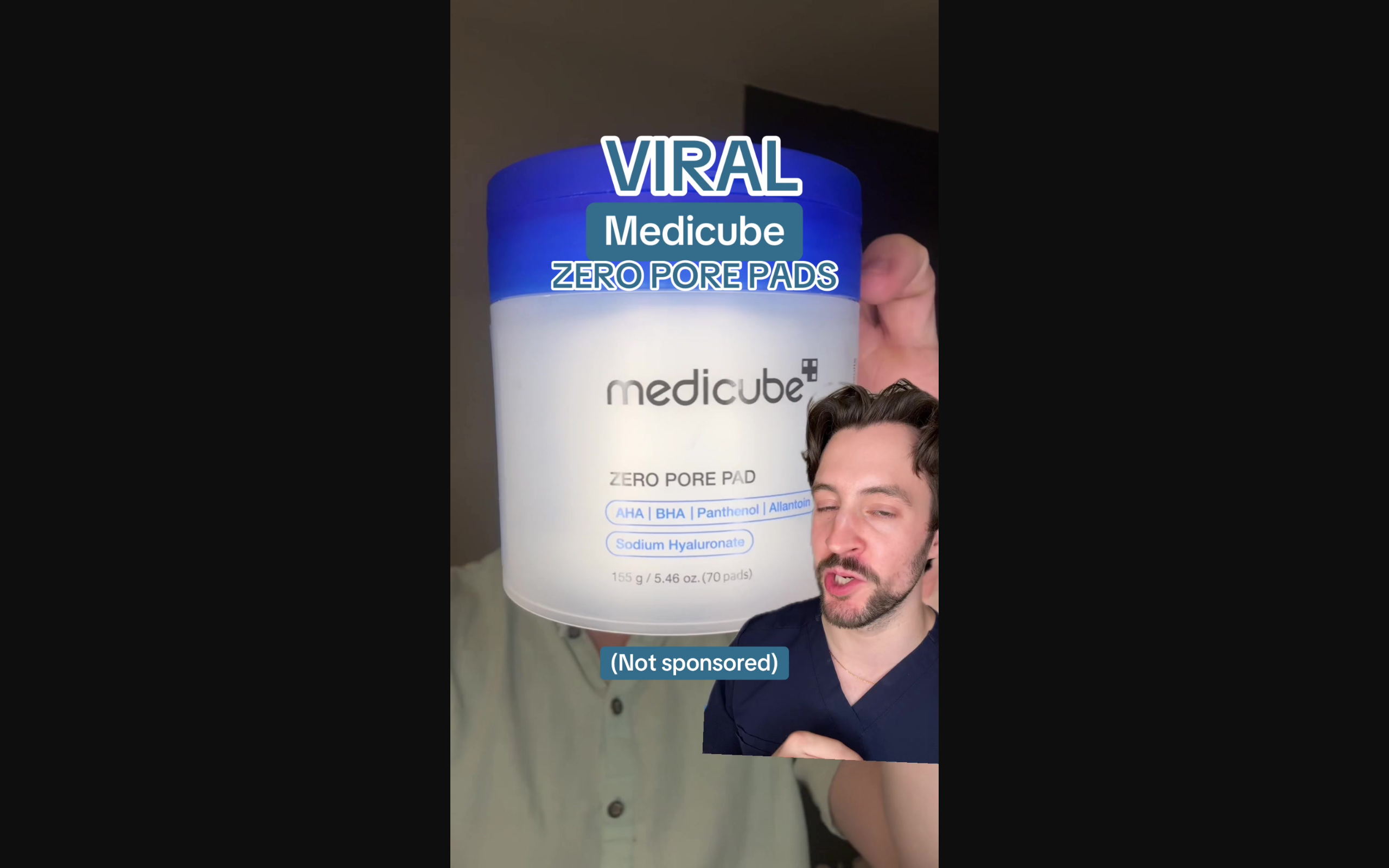 The transcript provides an accurate assessment of the Medicube Zero Pore Pads, correctly identifying the active exfoliating acids and highlighting the potential irritation risk from high fragrance and essential oil content.